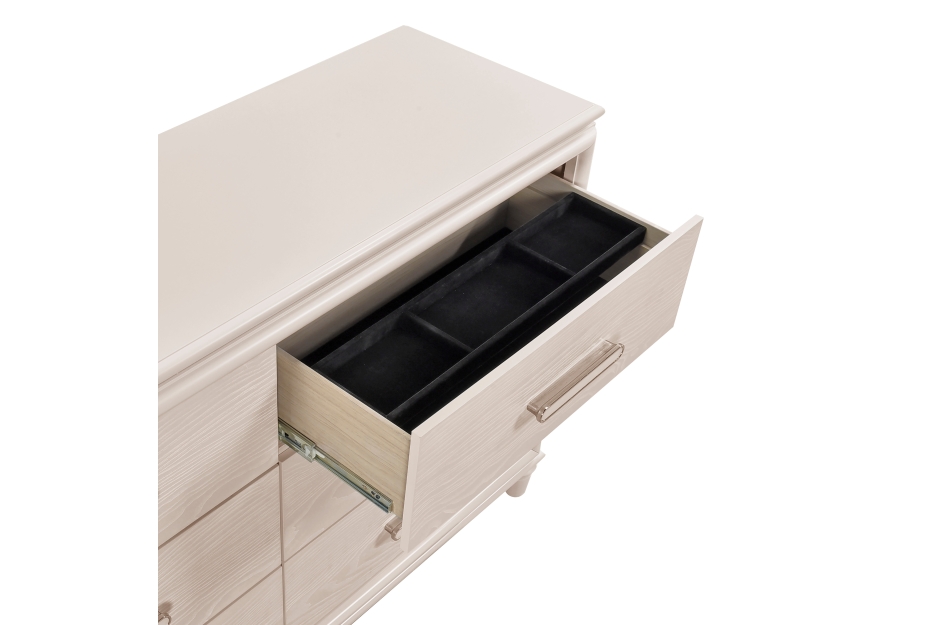 - Embossed panel drawers fronts | Chrome tone bar pulls