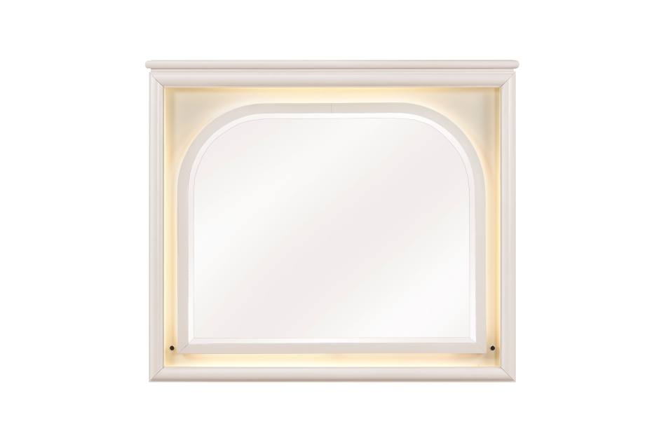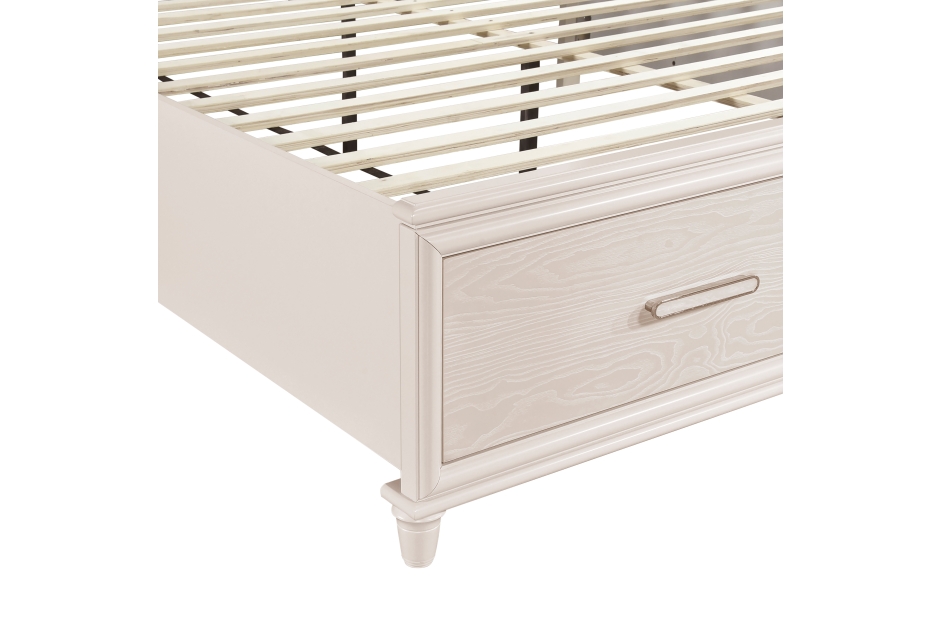 Revitalize your bedroom with this sleek and highly functional platform bed with footboard storage, delivering a modern aesthetic with smart, integrated convenience. The striking headboard is elegantly upholstered in soft chenille fabric and features built-in next-generatin COB LED lighting to create a sophisticated, natural glow. Finished in a contemporary white with subtle texture from the embossed panel drawer fronts, this bed is supported by high-quality construction using a blend of wood and engineered wood. Maximize your space with the footboard’s two spacious dovetail storage drawers, which glide smoothly on ball-bearing glides, and enjoy the streamlined convenience of a design that is ready for your mattress since a foundation or box spring is not required.